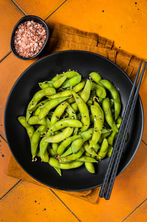 Boiled Edamame Soy Beans with sea salt and sesame seeds. Orange background. Top view.