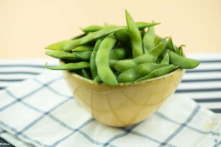 Boiled Edamame bean or young green soybean in yellow bowl