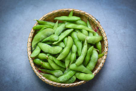 Green soy beans on basket, Fresh beans on dark background - top view