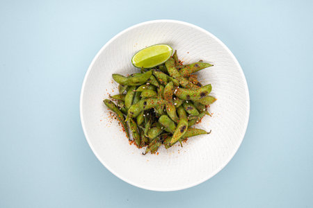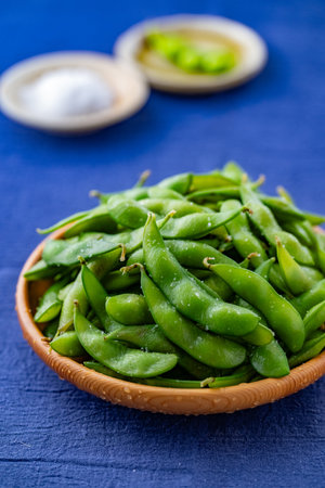 Edamame nibbles, boiled green soy beans, japanese food