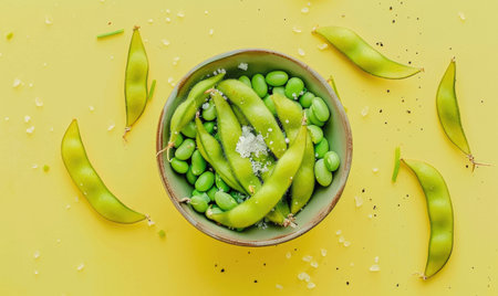 Edamame with sea salt in a bowl on a light yellow background