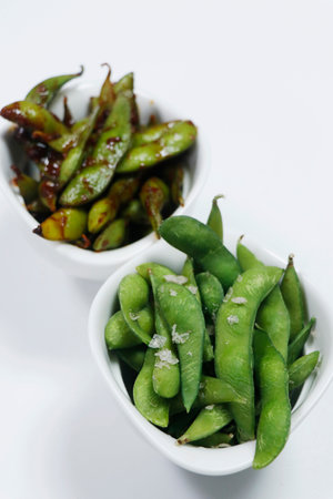 healthy food steamed and spiced soybeans known as edamame with white background