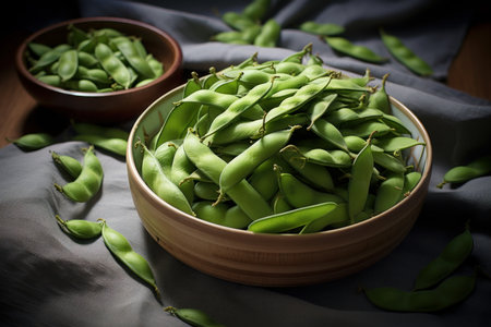 Japanese green beans in a black bowl, top view