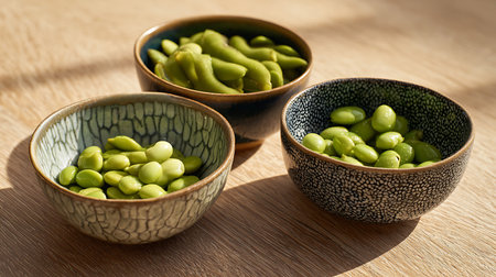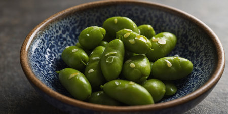 AI Generated. Edamame pods lightly salted and steamed served in a traditional Japanese ceramic bowl