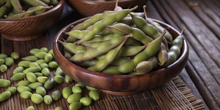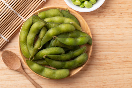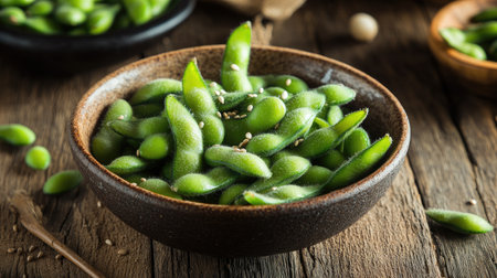 A bowl of edamame soybeans sits on a rustic wooden table, the vivid green color popping against the natural texture. Ideal for promoting healthy food options