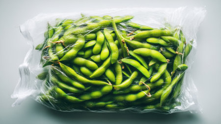 This image showcases a clear plastic bag filled with vibrant green edamame beans, perfect for cooking or snacking, emphasizing freshness and health.