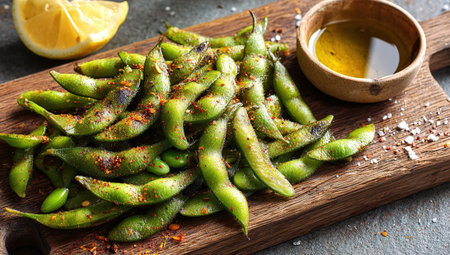 Boiled green soybeans with salt, pepper and lemon on wooden board