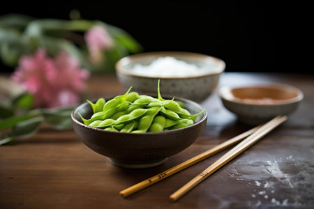 Green soybeans in a bowl with wooden chopsticks on the table