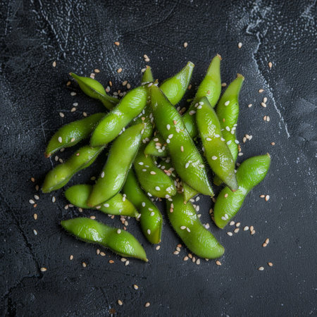 Vibrant edamame beans glisten with moisture, highlighting their freshness and natural appeal, perfect for a nutritious snack or vibrant meal addition.