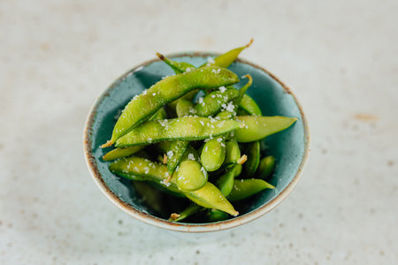 Edamame sprinkled with sea salt in a rustic bowl for a healthy Japanese snack option