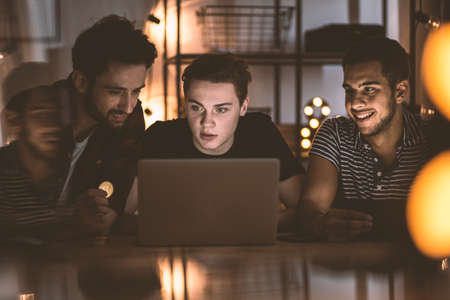 Friends using laptop to buy virtual currency and make money