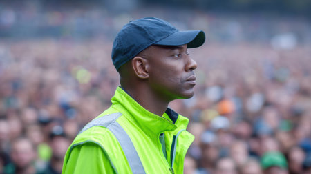 A dedicated security personnel in a neon jacket stands watchfully amidst a large crowd at an outdoor event, ensuring safety and organization.