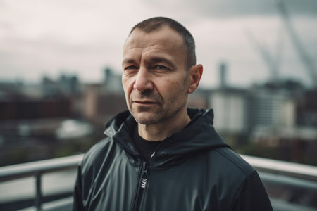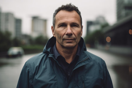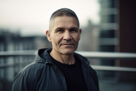 Portrait of a middle-aged man in a black jacket on the background of the city