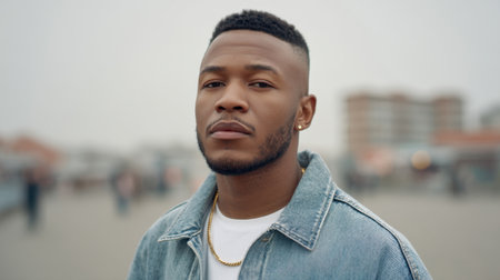 Young man exudes confidence in stylish denim jacket with a serene expression, against an urban background on an overcast day, perfect for lifestyle and fashion themes.