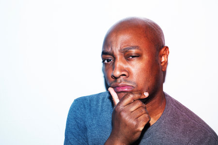 Portrait of african american adult in pain with sad and exhausted face looking concerned, worried and thoughtful in human emotions, facial expression and Depression. Isolated on neutral background.