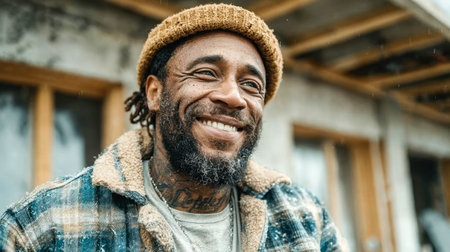Smiling construction worker stands confidently in front of scaffolding, showcasing warmth, pride, and determination in his expression.
