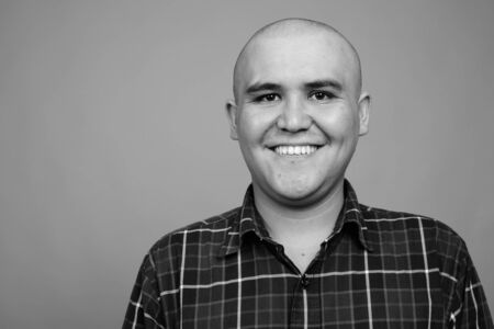 Young bald Asian businessman against gray background