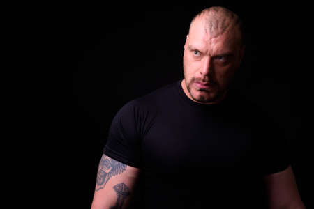 Portrait of muscular bald man against black background