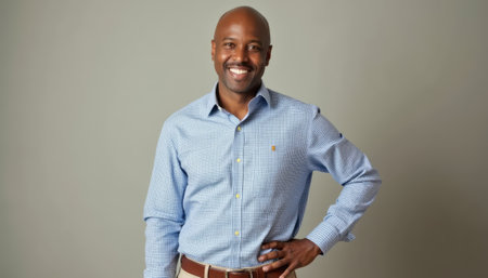 A cheerful African American man stands confidently with one hand on his hip, wearing a stylish blue checkered shirt. His warm smile and relaxed posture exude positivity and approachability, making this image perfect for professional or personal branding.