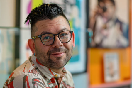 Vibrant portrait of a smiling man in colorful outfit against abstract background