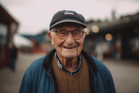 Portrait of an elderly man in a cap and glasses on the train station