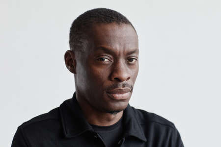 Minimal close up portrait of serious black man looking at camera while standing by white wall, copy space