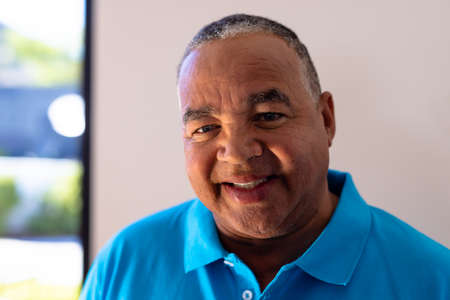 Close-up portrait of smiling biracial senior man against white wall in retirement home, copy space. Happy, unaltered, support, assisted living and retirement concept.