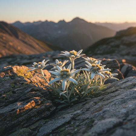 Edelweiss blooming on a rocky alpine summit with distant snowy peaks under a clear blue sky, a pristine high-altitude scene of rugged mountain flora and tranquil wilderness