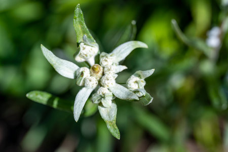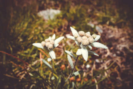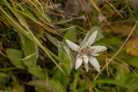 Close up on rare alpine mountain blooming flower edelweiss (Leontopodium alpinum) in natural environment