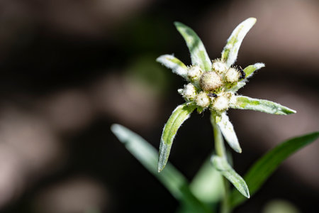 Closeup of a protected rare Edelweiss flower (Leontopodium alpinum) in Bucegi mountains, Romania. Shallow depth of field, selective focus.