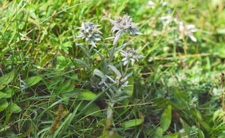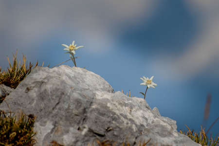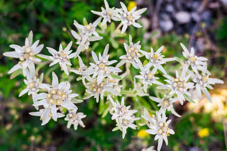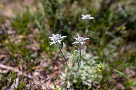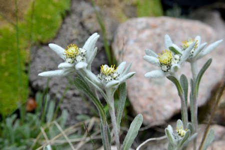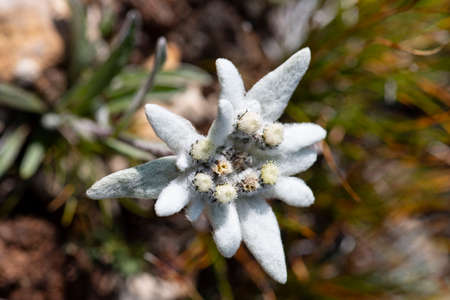 Wild and beautiful mountain flower Edelweiss, a symbol of high mountains. Nature reserve, mountain flowers