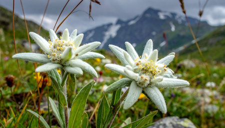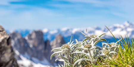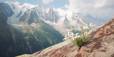 Edelweiss flowers are blooming on a rocky mountain slope with a snowy mountain range in the background, epitomizing the concept of resilience and survival in challenging high-altitude nature
