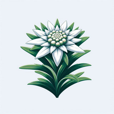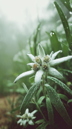 The Edelweiss in light fog, dew on leaves, light soft diffused, threequarter view.