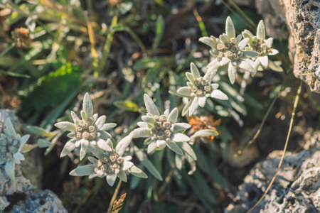 Edelweiss alpinus (Leontopodium alpinum) in the mountains at sunrise