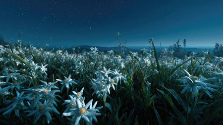 Beautiful floral background with delicate edelweiss flowers growing in the highlands on a meadow against the backdrop of mountains and cloudy sky