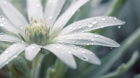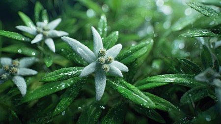Edelweiss in gentle light rain, soft raindrops visible on vivid green leaves, natural realistic style, bright fresh colors, balanced wide composition, cinematic framing, highly detailed, seamless for video continuation.