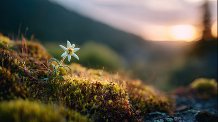 Photo of a small Edelweiss growing on moss at sunrise, symbolizing hope and new beginnings. Web banner with copy space on the right for product placement.