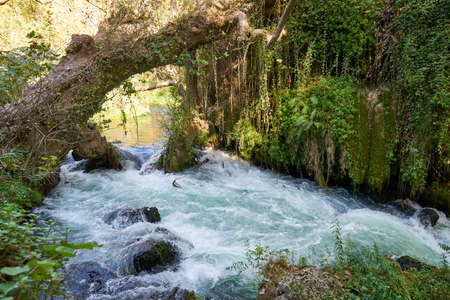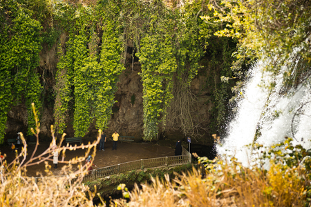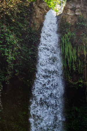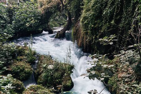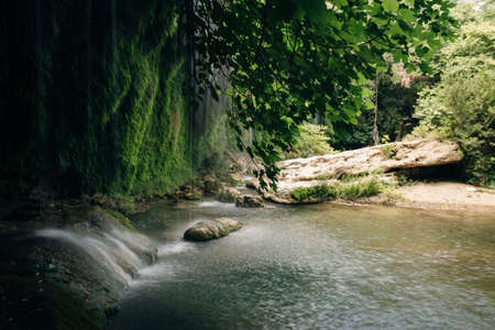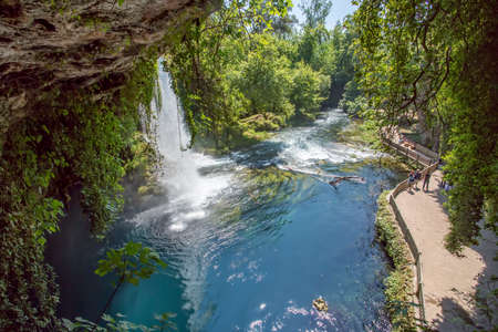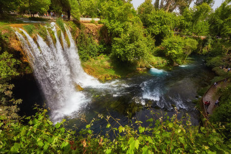 The scenic lush green park surrounds the gorge with Upper Duden Waterfall, the popular tourist place, that keeps shade and fresh air even in hot summer days, Antalya, Turkey.
