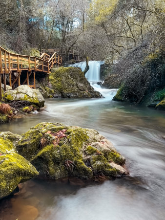 Serene forest scene with a wooden walkway over a flowing stream, surrounded by moss-covered rocks and trees, creating a tranquil atmosphere in Pindelo, Outeiro, Oliveira de Azemeis, Portugal