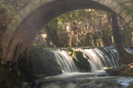 Artificial waterfall passes through the ruins of a water mill in Tuscany