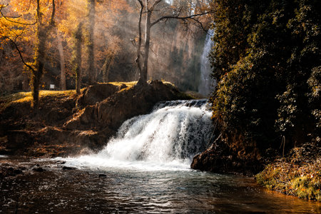 Rushing waterfall flowing through a forest with golden autumn trees and sunbeams