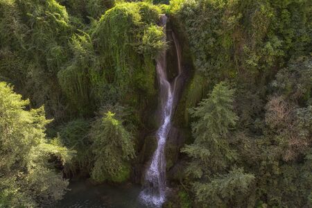 Aerial drone view of a natural waterfall close-up. Spray. Foam. Green vegetation on the rocks. Natural element. High quality photo