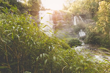 grass with background of Wachiratarn Waterfalls in Winter, Chiagmai, Northern of Thailand