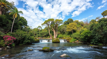 Panoramic view of a beautiful waterfall in the botanical garden of San Miguel de Allende, Mexico