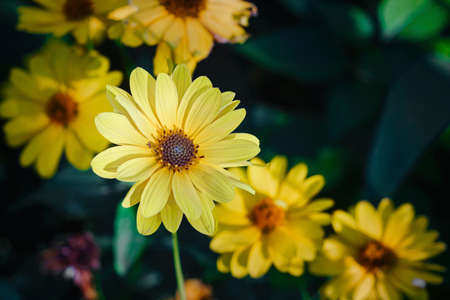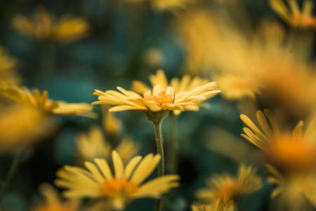 Beautiful fairy dreamy magic yellow flowers with dark green leaves in flowerbed, toned with filters in retro vintage style effect, soft selective focus, blurry background, copyspace for text