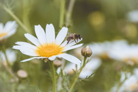 yellow flowers with a bee on them in the rays of the setting sun. A bee sits on a yellow daisy in a field.