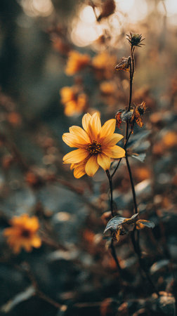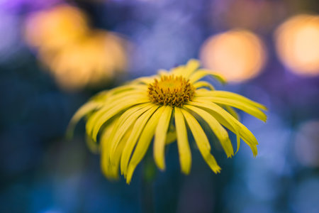 Yellow daisy with blurred bokeh background, serene nature view. Floral beauty and tranquility concept