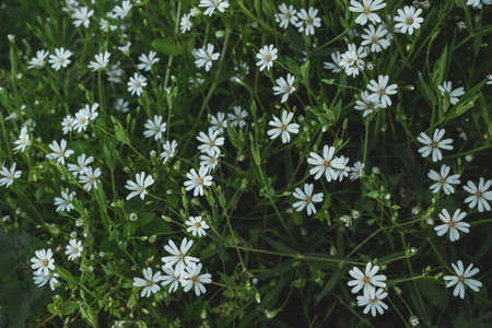 Floristics, botany concept - delicate little white flowers from lower macro angle against background of sunset with soft focus copy space. Closeup of Stellaria holostea L. family Caryophyllaceae.