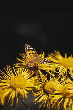 beautiful dark yellow flowers growing on a green meadow and a butterfly on them