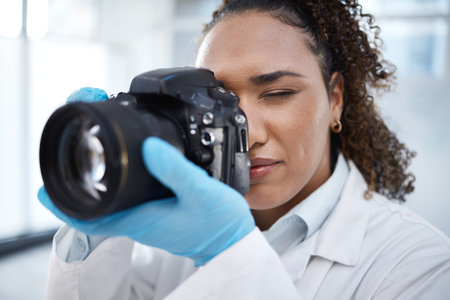 Camera, photography and medical with black woman in forensics laboratory for investigation, crime scene and evidence. Research, analytics and observation with girl and digital pictures for science